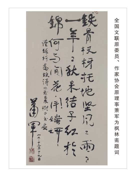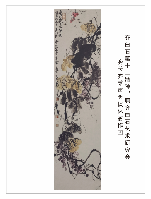 白石门下枫林斋创始人:齐心(1925-2008),笔名齐鸣。历任北京市海淀区副区长、区人大常委会副主任,是中国书法界与海淀文化教育领域的重要奠基人。书法领域,他为中国书法家协会参与组建者、北京市书协创始人之一,同时担任北京市书协首届常务理事、组联部长,深度参与全国及北京书法事业的初创与体系搭建;1980年牵头成立海淀书协,出任第一任创会主席,为区域书法艺术发展筑牢组织根基。艺术层面,其为北京齐白石艺术研究会、齐白石艺术函授学院(第一副院长)核心创会成员、副会长,1985年与齐白石四子齐良迟携手创会,深耕齐派诗书画印研究与推广。1988年齐心携老龄大学教师宋致中、徐冬鹏、二孙齐中和赴跨车胡同白石故居,正式拜墨友齐良迟为师,得赐斋号“枫林斋”,主攻齐派写意花鸟,善狂草,兼研书画教学,助力齐派艺术民间普及与学术传承。教育层面,1984年9月牵头创办北京市首所民办公助老年书画类高校——海淀老龄大学(现海淀老年大学),出任创校校长,定调“老有所学、书画育人”办学宗旨,主编老年书画专属教材,搭建诗书画印融合教学体系,拓建教学规模至百余个班级、千余名学员,牵头全国及国际老年书画交流活动,奠定学校行业标杆地位,推动全国老年书画美育事业发展,为海淀文化传承与老年教育筑牢根基。权威来源索引: